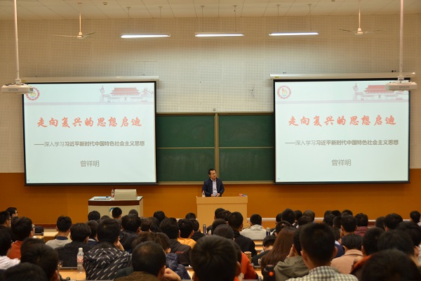 曾祥明老师以《走向复兴之路的思想启迪-深入学习习近平新时代中国特色社会主义思想》为题目,向员工们介绍了习近平总书记的从政之路和新时代中国特色社会主义思想,阐述了习近平新时代中国特色社会主义思想的精神实质,强调习近平总书记和全体共产党人的初心就是为人民服务和实现中华民族的伟大复兴。曾祥明老师为新生详细解读了习近平总书记的青年成才观,列举了青年成长成才的“二十力”,劝勉各位同学积极响应十九大的伟大号召,立志做一名有理想、有本领、有担当的青年。