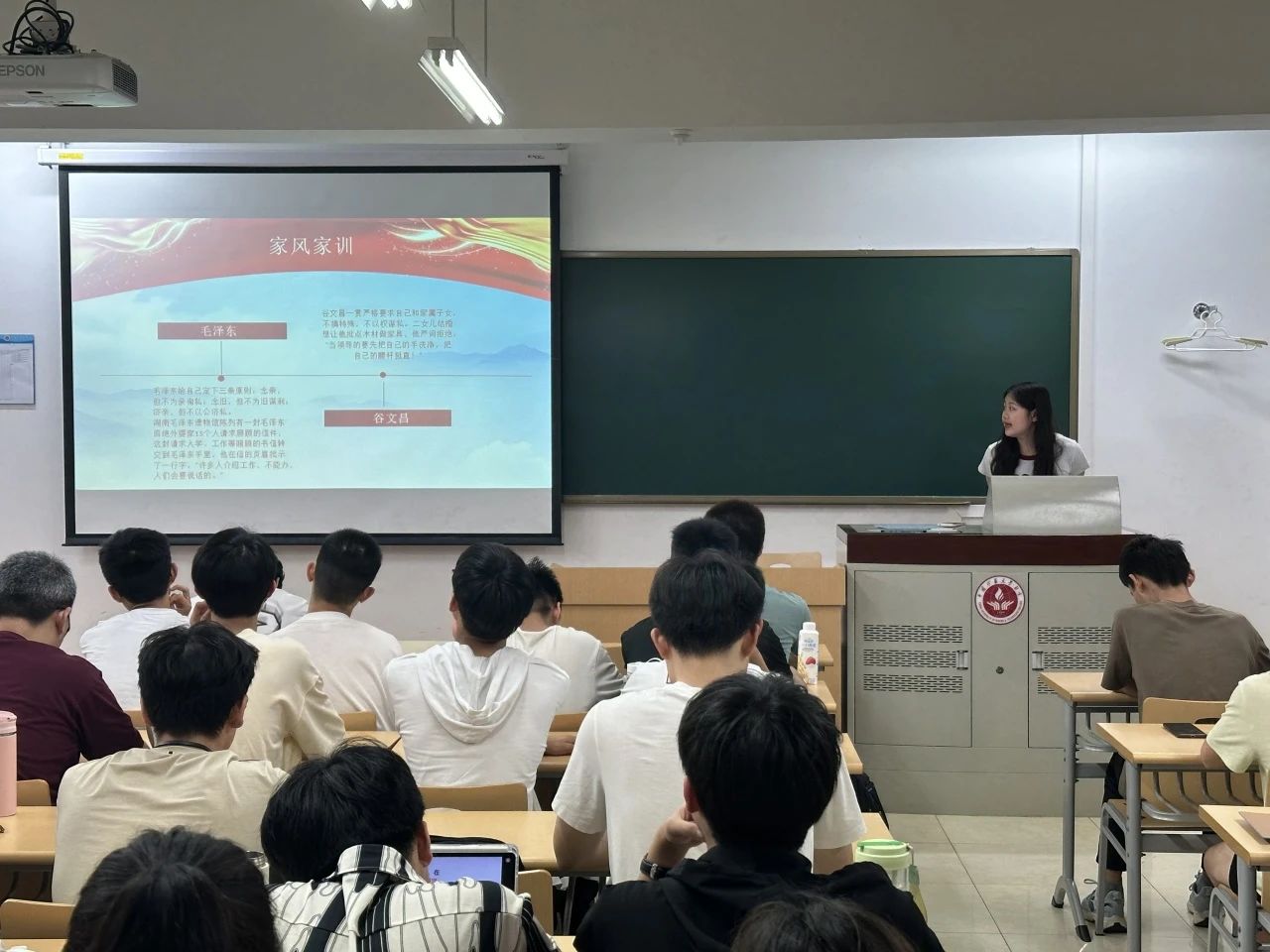 本科生第二党支部党员白文婷以《党史上的生活纪律建设》为题,讲解什么是生活纪律,接着围绕保持艰苦奋斗的生活作风、遵守良好家风的生活规矩、养成健康文明的生活方式四大部分展开,旨在进一步加深同学们对党的生活纪律的认识。通过举毛泽东、周恩来、焦裕禄、谷文昌等同志真实发生的家风家训故事,引导同学们要严于律己,让自身与家人言行都经得起考验、当得起表率。