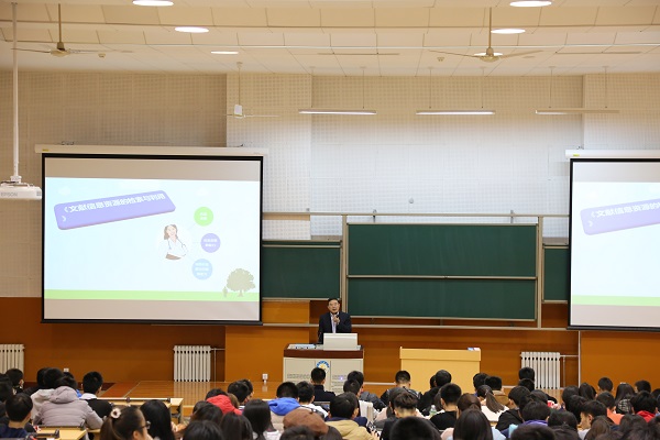 唐兵馆长热情洋溢地介绍了公司路校区图书馆和沙河校区图书馆的馆藏概况以及图书馆的各项服务功能。目前两校区的近百万册图书实现了通借通还,全面覆盖各学科的文献数据库每周7天24小时开放,智慧学习空间为读者提供了舒适、实用且引领时尚的学习研讨环境。唐兵馆长详细介绍了CNKI等中外文数据库的信息及使用方法,并现场登录图书馆官网,对图书馆文献数据库资源的检索进行了演示。