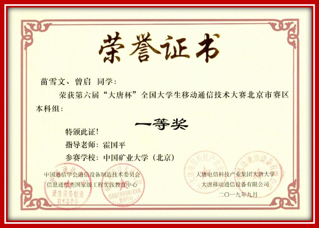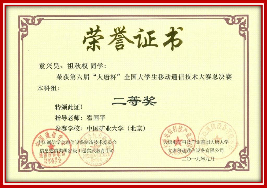 由中国通信学会通信设备制造技术委员会、大唐电信科技产业集团大唐大学、信息通信类国家级工程实践教育中心主办,大唐移动通信设备有限公司承办的2019年第六届“大唐杯”全国老员工移动通信技术大赛于2019年7月14日闭幕。由通信与电子工程系霍国平老师带队的公司参赛员工团队共获得6项荣誉。其中信息工程2016-2班苗雪文、曾启同学获北京市赛区本科组一等奖1项;信息工程2016-1班袁兴昊、祖秋权、侯麟朔、刘璐四位同学获北京市赛区本科组二等奖2项;信息工程2016-2班陆宜斌、刘洋、2017-2班潘子健、王萌四位同学获北京市赛区本科组三等奖2项;另外,袁兴昊、祖秋权参赛小组还获得了全国总决赛本科组二等奖的好成绩。