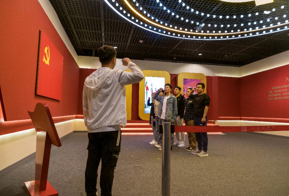 参观最后,在支部书记赵法起的带领下,全体党员面对党旗重温入党誓词,庄严对党旗宣誓。