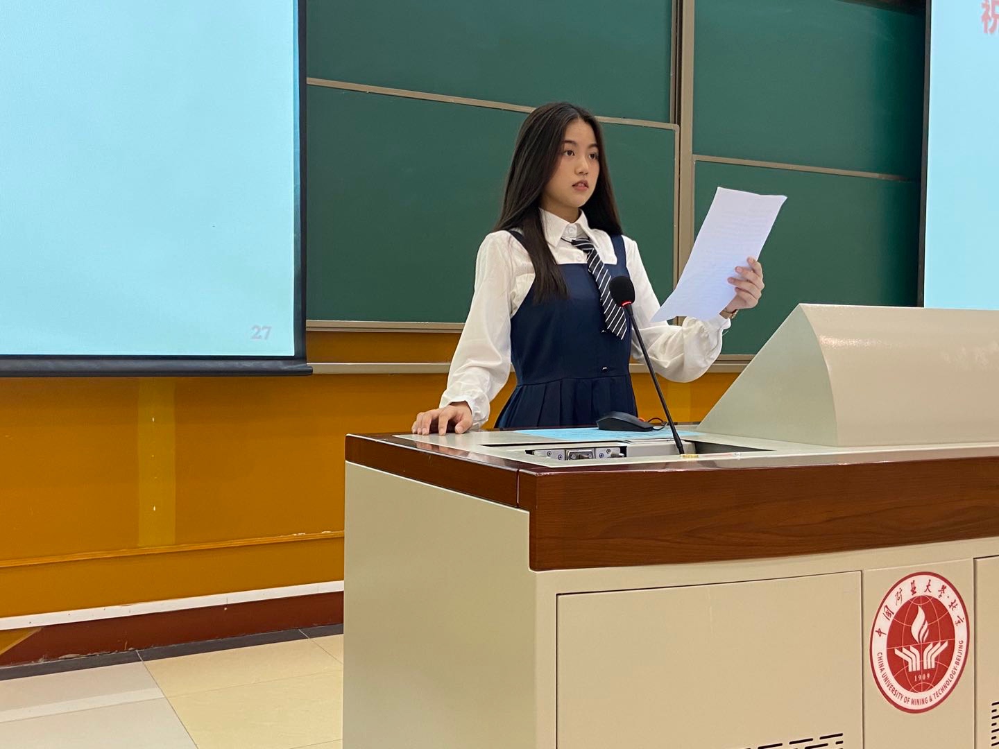2021级机械类专业吴锁同学代表新生发言。她表示要恪守“明德至善,好学力行”的校训,传承生生不息的矿大精神,树立明确的目标,不忘初心,砥砺前行,不断提高自己的专业和文化素养,争做积极有为的矿大学子。