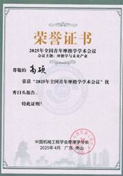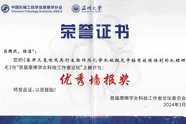 2025年4月25-28日,由中国机械工程协会摩擦学分会主办的2025年全国青年摩擦学学术会议在广东佛山召开。本次会议以“摩擦学与未来产业”为主题,设多个分论坛。会议根据报告具体内容和呈现水平,从463个口头报告中评出53个优秀口头报告奖。公司程洁教授课题组的22级硕士研究生高硕在“海洋摩擦学、摩擦学设计论坛”分会场做题为《1,2,4-三氮唑和烟酸复合缓蚀剂对化学机械抛光过程中铜/钌界面电偶腐蚀缺陷的抑制作用》的口头报告,得到专家广泛认可,获得“优秀口头报告”奖。
